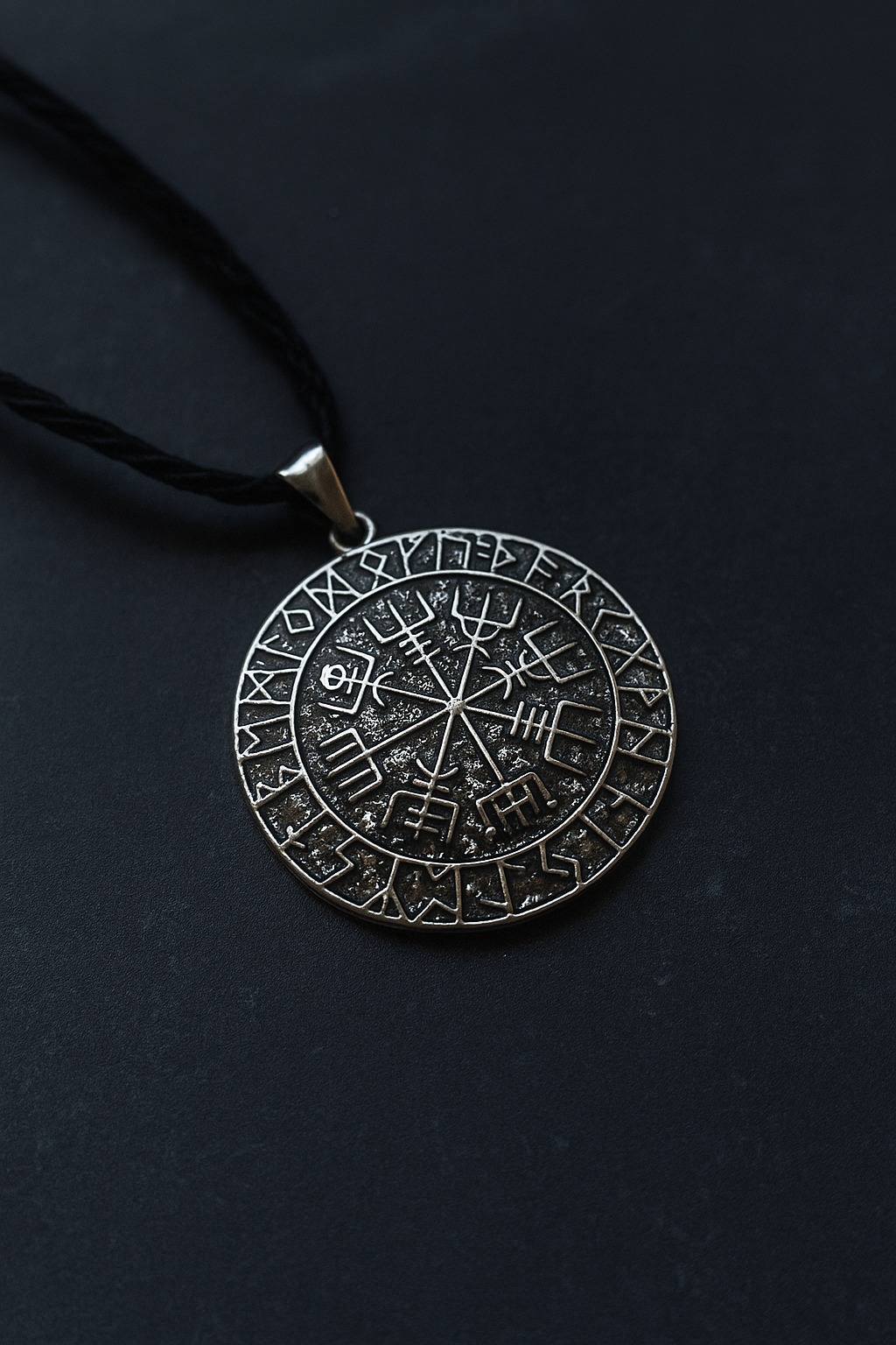 Este colgante de acero inoxidable representa la brújula vikinga también llamada Vegvísir.