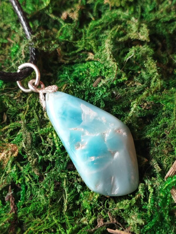 La piedra larimar se cree que calma las emociones, reduce el estrés, aumenta la confianza y la autoestima, y fortalece la conexión con la naturaleza. Además, se asocia con el chakra de la garganta, promoviendo la comunicación y la expresión.