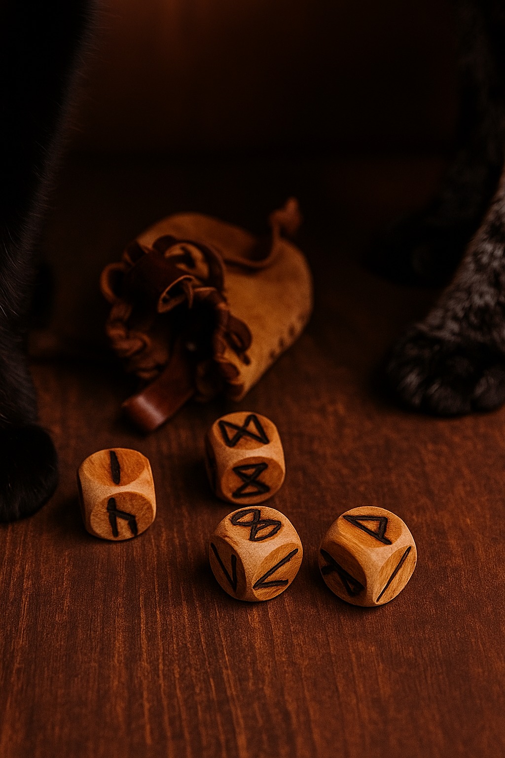 Dados rúnicos pirografiados a mano los cuales van junto con sus instrucciones de uso.