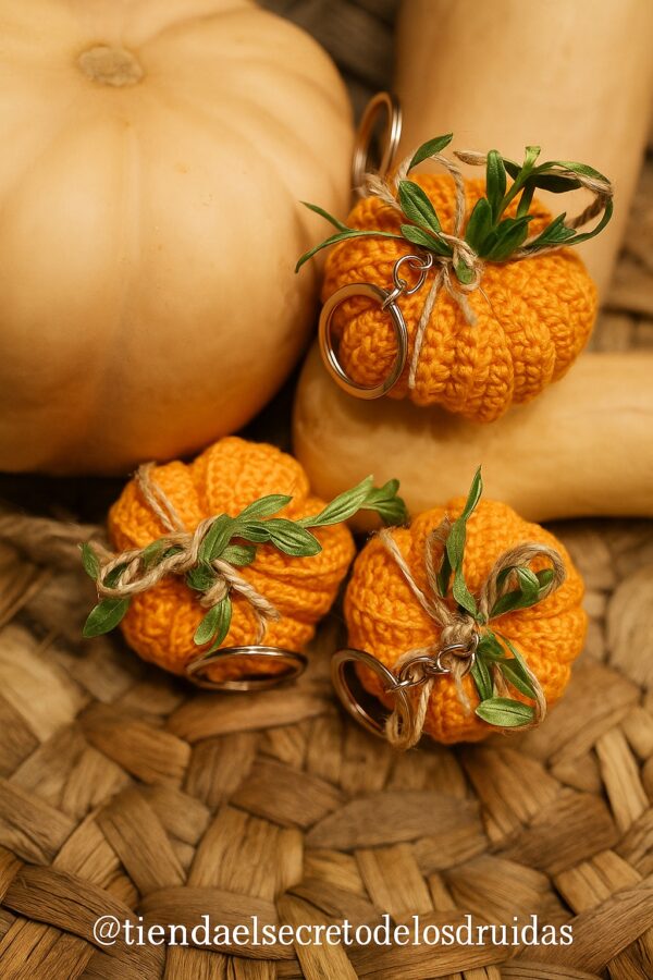 Estos llaveros de calabazas de Samhain están disponibles todo el año. Están realizadas de manera artesanal en colores naranjas.