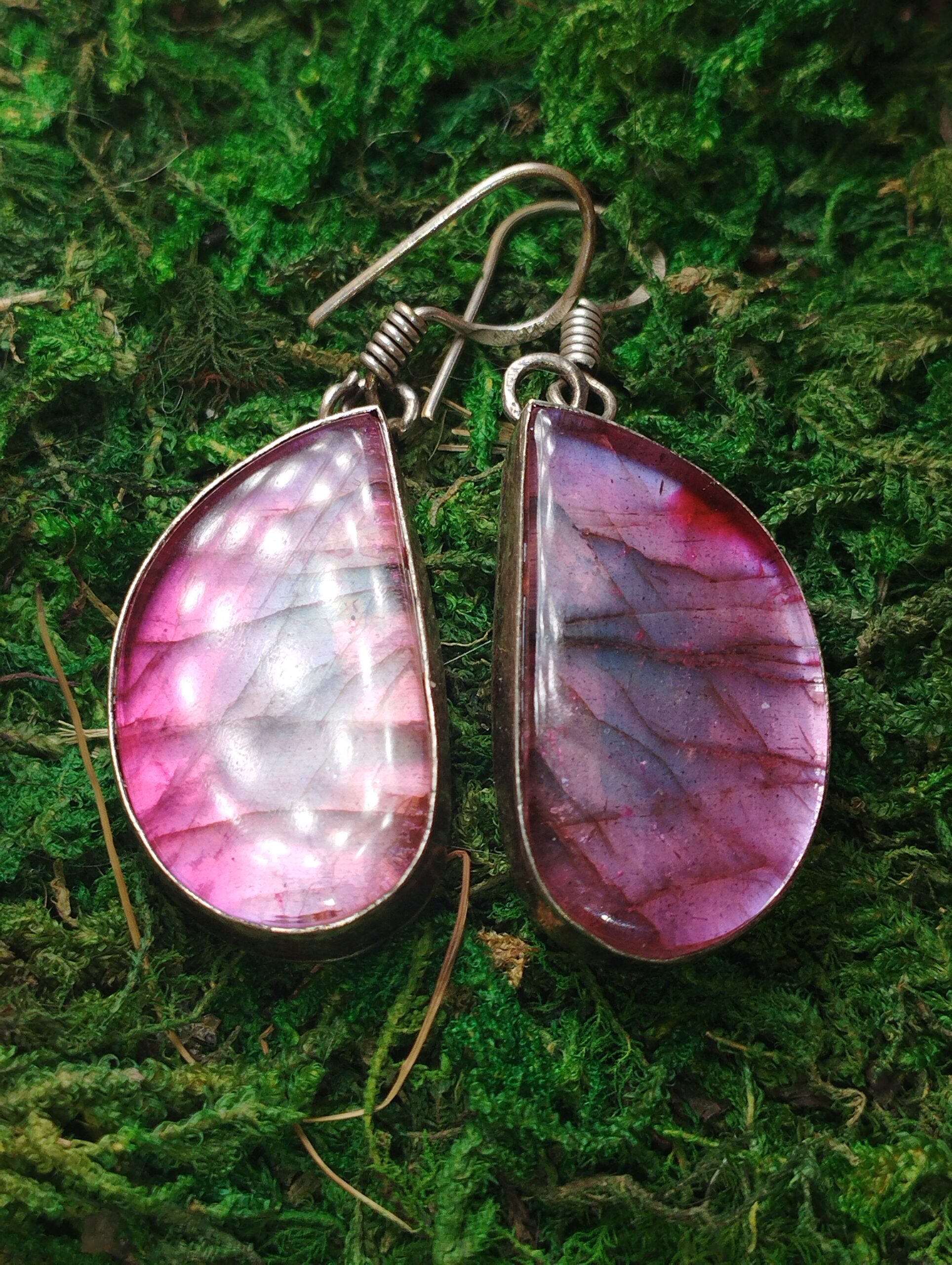 Pendientes de plata de ley 925 con labradorita con destello en tonalidades rosas y rojas.