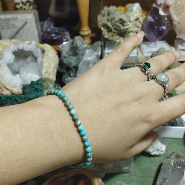 La turquesa, en el ámbito espiritual, se asocia principalmente con la intuición y la comunicación .Se cree que potencia la meditación, facilita la comunicación clara y honesta, y estimula la expresión creativa. Además, se le atribuye la capacidad de proteger contra energías negativas y purificar el aura.