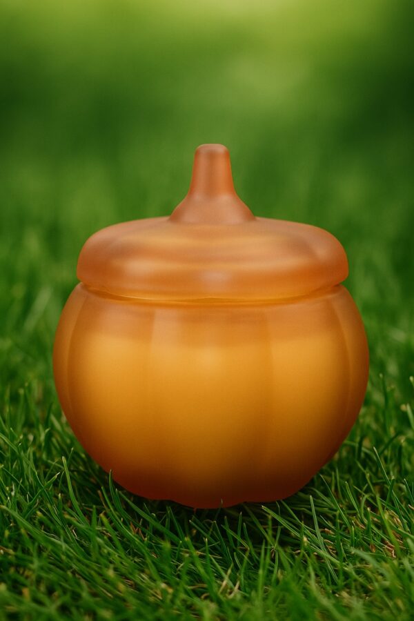 Vela con aroma a café y vainilla en tarro de cristal en forma de calabaza color naranja con tapadera.