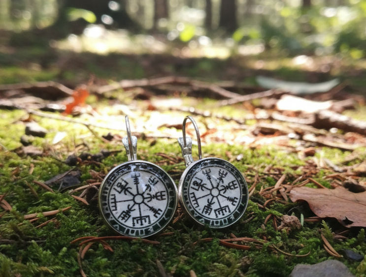 Estos pendientes que cuelgan de acero inoxidable y resina llevan la simbología del vegvisír vikingo, más bien conocido como la brújula vikinga en tono blanco. 15,00 € IVA Incluido -